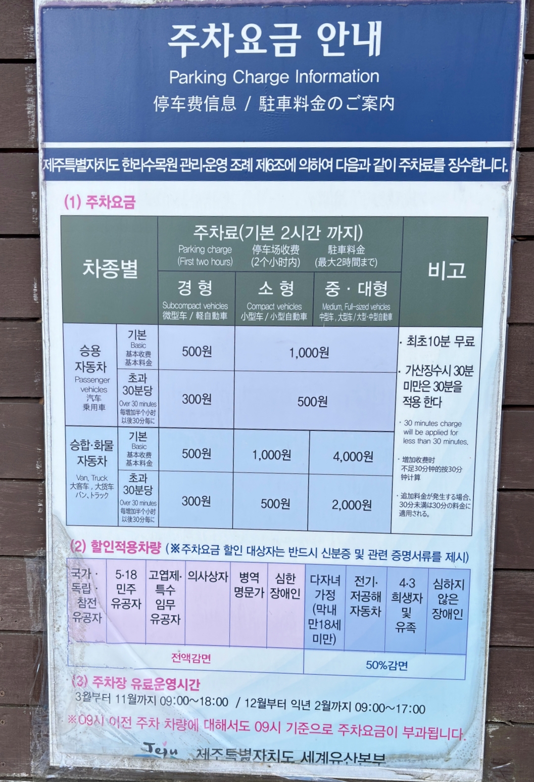 주차요금 받는 시간은 동절기 09:00 ~ 17:00 / 하절기 09:00 ~ 18:00 이다.