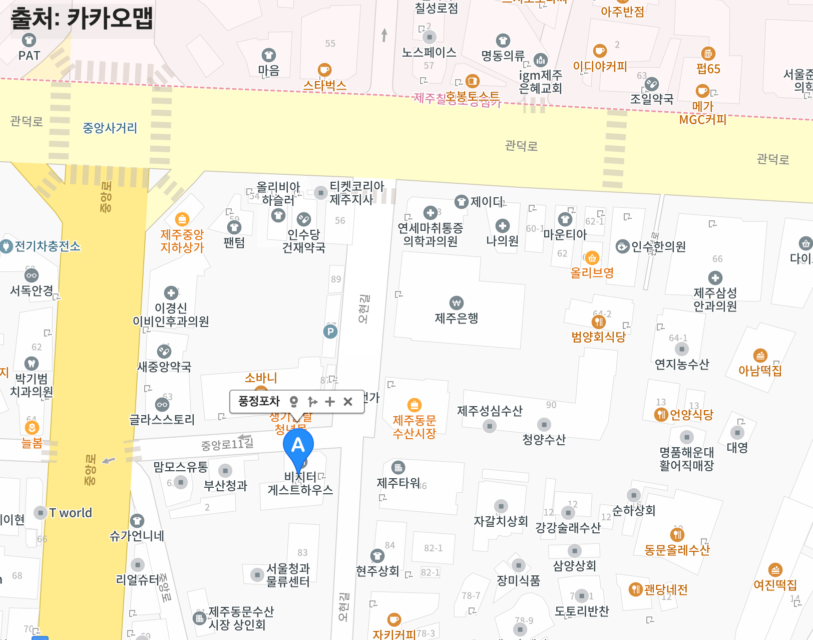 풍정포차는 제주 동문시장 앞에 있다. 동문시장은 동문재래시장, 동문공설시장, 동문야시장 등 구역이 대략 나뉘어 있는데 이중 서쪽에 수산물집들이 모여 있어 이 파트가 동문수산시장이다. 풍정포차는 동문수산시장 6번 게이트 앞에 있다. 위 지도에서 동문수산시장과 제주타워 사이가 동문수산시장 6번 출구이다.