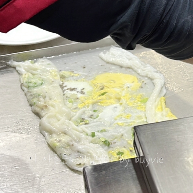 반죽을 얇게 찜기에 올리고 김이 펄펄나는 요것을 꺼내 촥촥 접고 썰고 해 주신다.