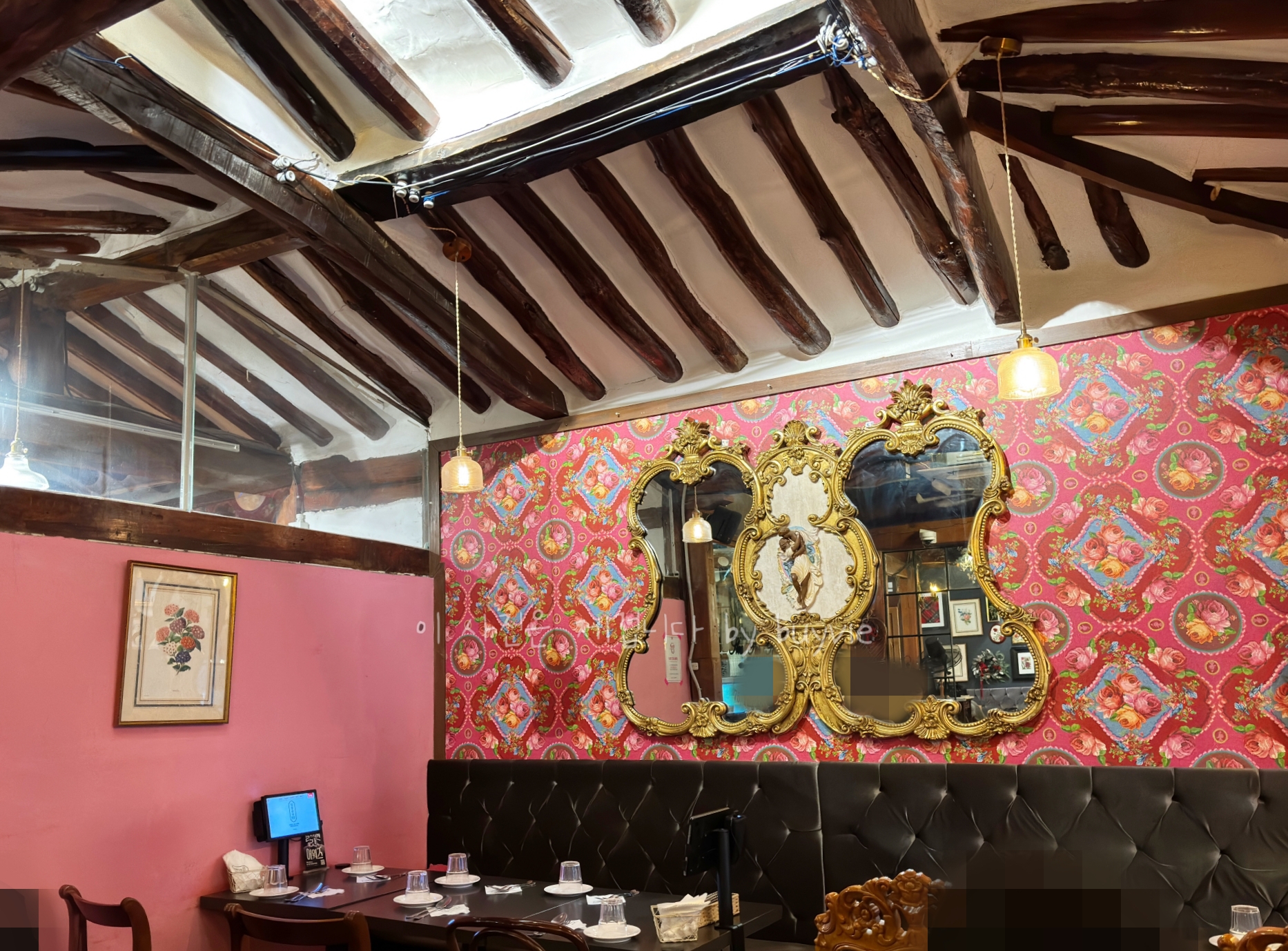 살롱순라 서순라길점은 한옥을 개조한 이탈리안 식당이다. 지붕의 서까래가 선명하지만 벽지며 인테리어는 고풍스러운 유러피안 스타일이다. 제국시대의 고급 레스토랑을 연상시키는 컨셉으로 특별히 새로울 것은 없지만 공이 많이 드는 인테리어다. 빈티지 제품을 열심히 사 모으느라 애 쓰셨을 듯하다.