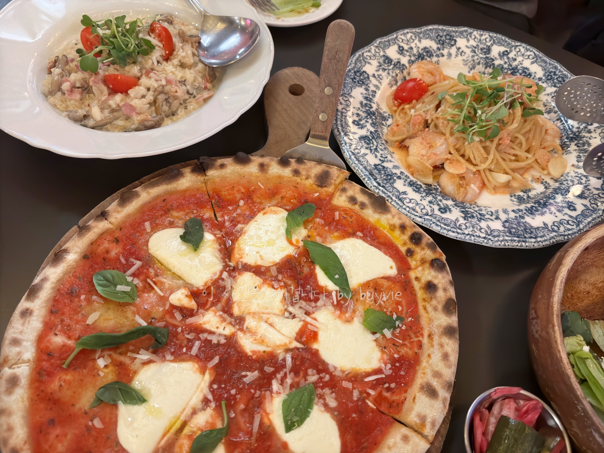 우린 새우 명란 크림파스타, 베이컨 버섯 크림 리조또, 마르게리타 피자, 수제 리코타 치즈 샐러드를 주문했다. 3명이지만 4디쉬주문, 양이 많은 편은 아니다. ㅎ.