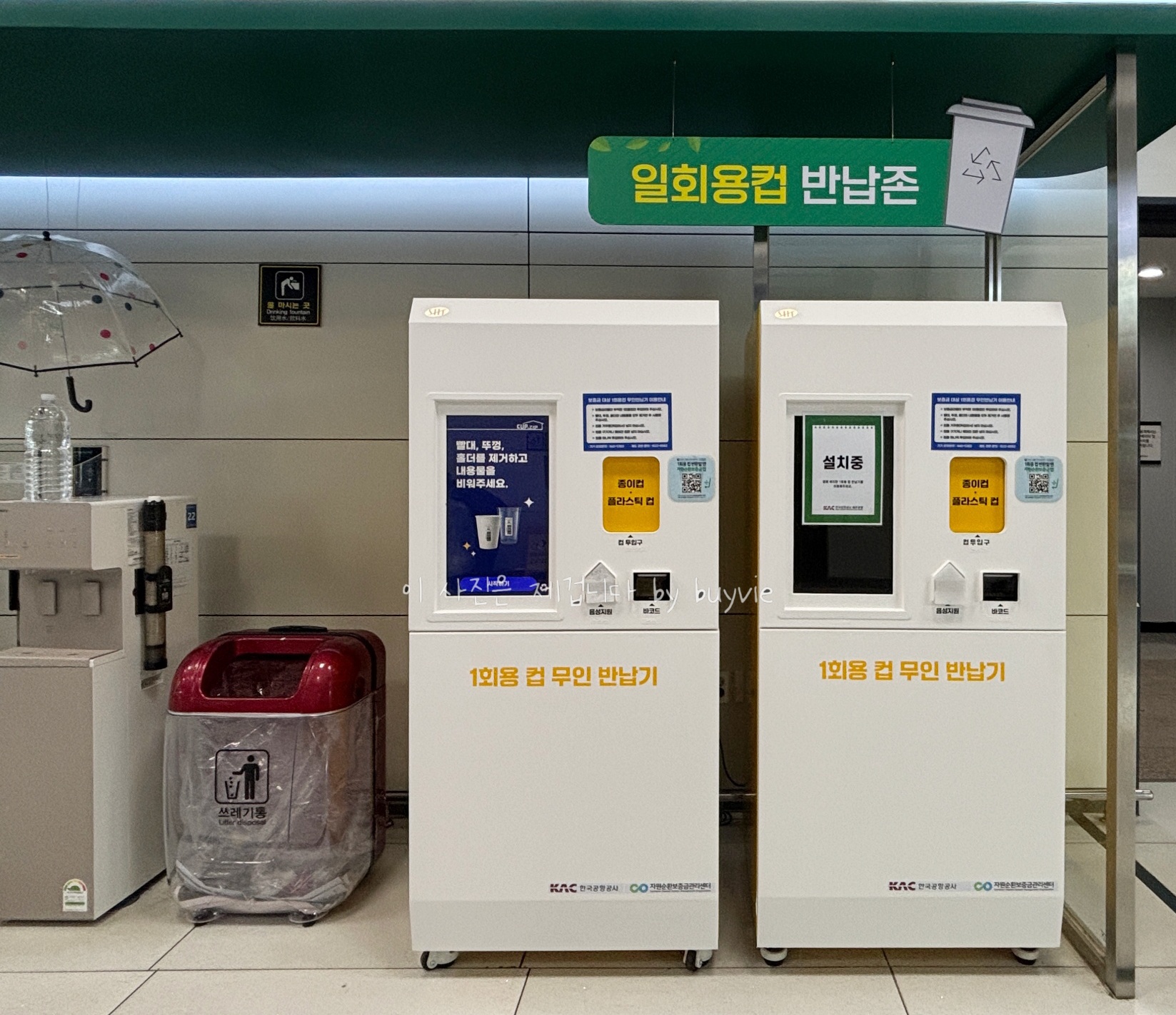 여기는 오멍가멍 에코존이고 정수기 옆, 사진의 왼편으로 가치우산 홍보존이 있다. 1회용컵 무인반납기도 있다. 참고로 제주는 테이크아웃시 종이컵을 제공하지 않는 매장이 많다. 대표적으로 스타벅스가 1회용컵을 쓰지 않는다. 보증금을 내고 컵을 사는 것이 귀찮고 아깝다면 미리미리 텀블러 하나 가져오는 게 좋다.