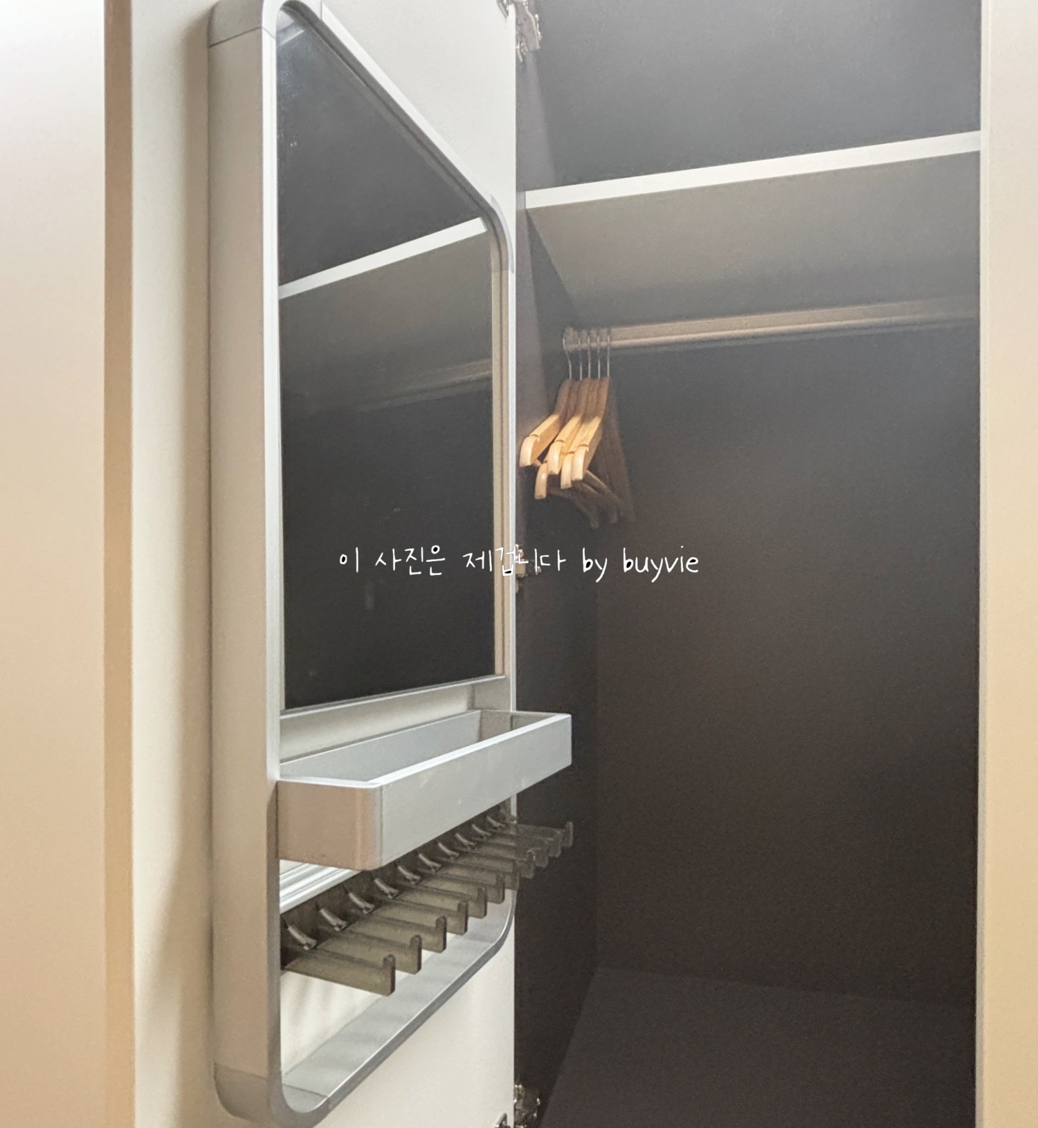 침대 아랫 쪽으로 TV가 벽에 달려 있고, 작은 수납장, 그리고 화장대는 어디있나? 화장실 앞 붙박이장 문을 열어보면 거울이 달려있다. 샤워하고 머리 말리고, 옷 입고 하는 동선이 좋다.
