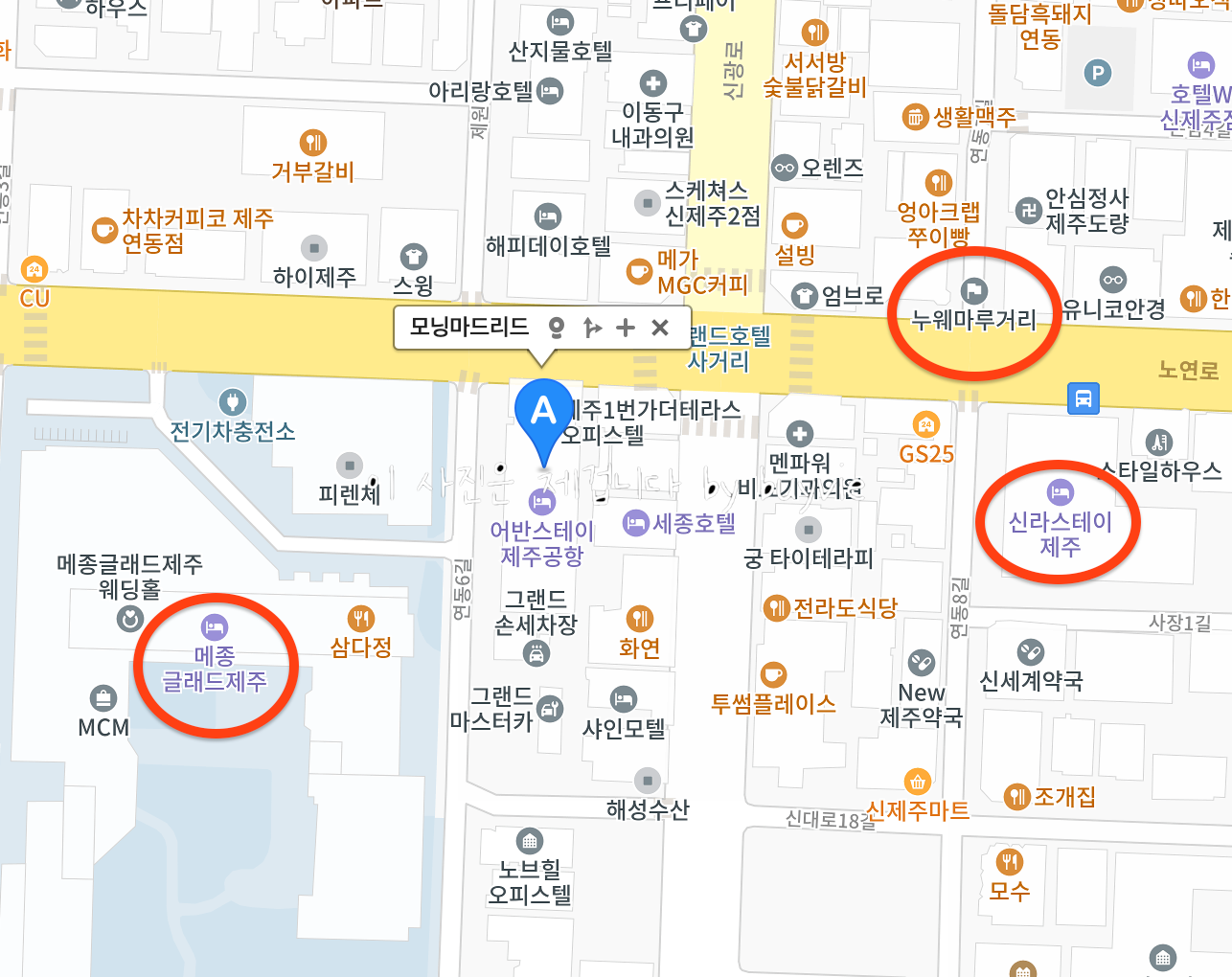 제주공항 근처 모닝마드리드의 위치부터 냅다 확인하고 시작하겠다. 모닝마드리드는 제주의 여행자 거리라 할 수 있는 누에마루거리 옆에 있다. 신라스테이제주 앞에 있는 은남동 버스정류장과 3분 거리, 제주에서 교통의 요지라 할 수 있는 곳이다. 제주공항에서 차로 10분, 버스로도 20분 이내로 도착하는 곳으로 비즈니스 트립, 나홀로 여행자, 뚜벅이 여행자에게 편리한 위치이다.