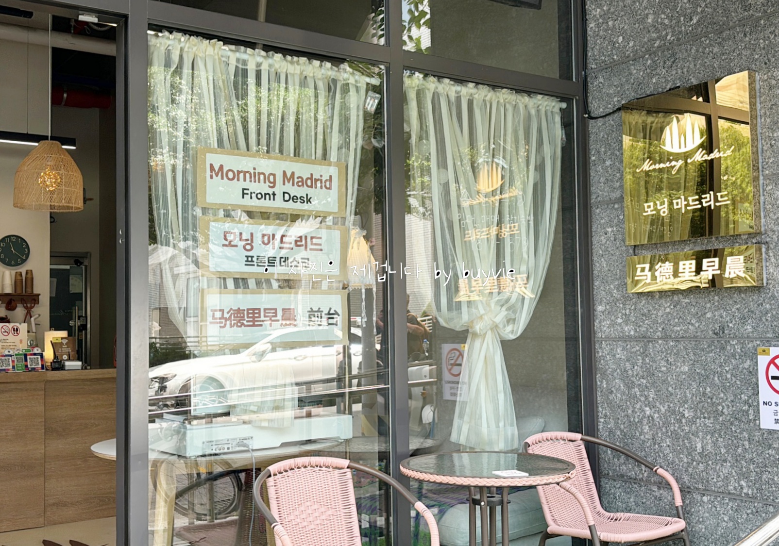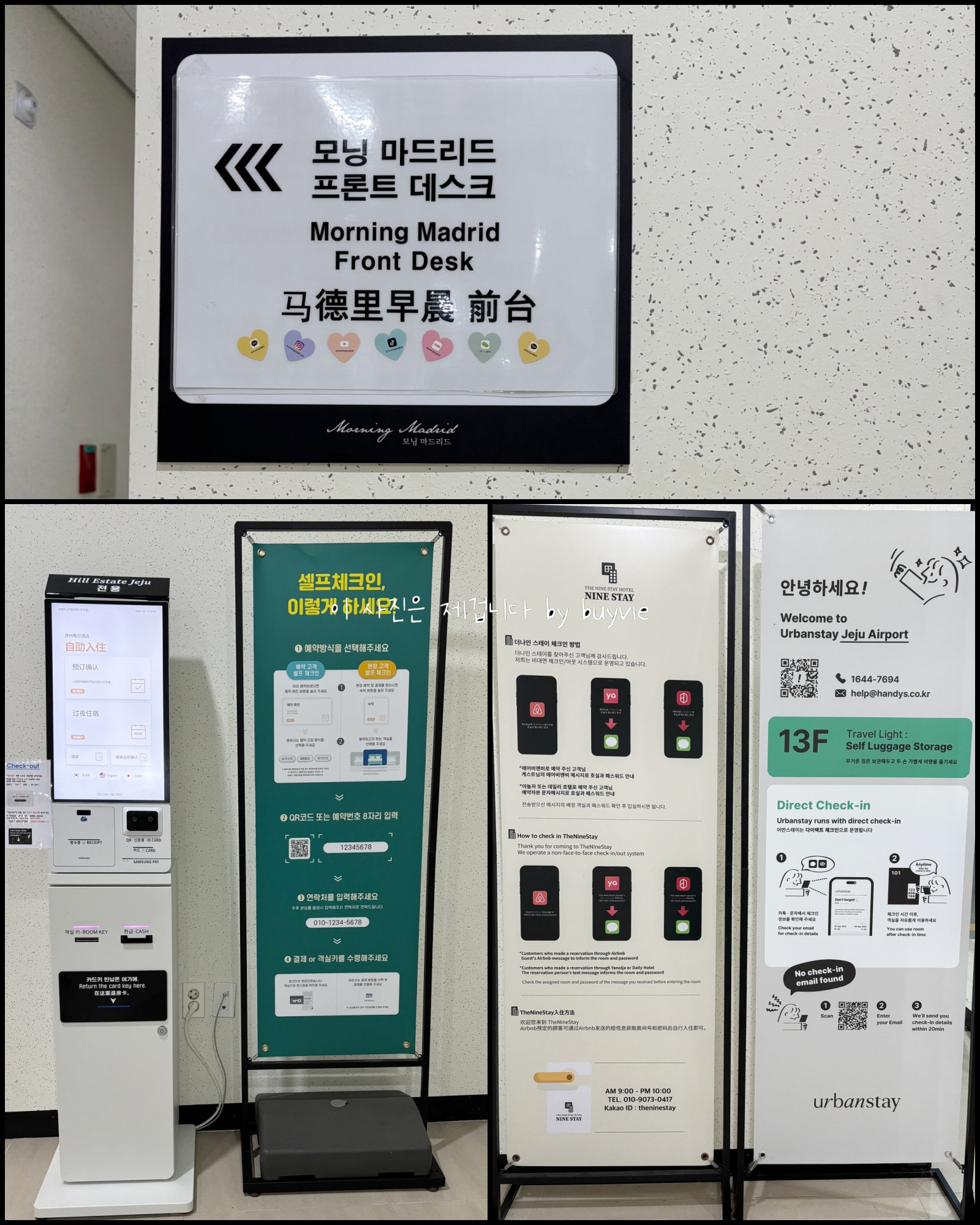 후에 알게 된 사실이지만 이 건물은 오피스텔 건물이다. 개인 입주자들도 물론 있고, 단기 임대를 하는 업체가 몇군데 들어와 있다. 그렇기 때문에 체크인 방법도 각기 다르다. 키오스크를 사용하는 힐 에스테이트, 어플을 사용하는 어반스테이, 그리고 내가 묵었던 모닝마드리드의 경우는 프론트 데스크를 따로 운영한다. 이게 경쟁력인 듯.